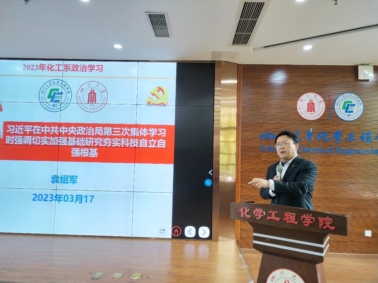 接着,化学工程系系主任袁绍军同志结合2022年度事业发展工作,领学“习近平在中共中央政治局第三次集体学习时强调切实加强基础研究夯实科技自立自强根基”等内容。袁绍军同志结合学院特点,以一线科研人员的身份思考,对学习素材做了深入讨论和例举。他鼓励科研人员静下心,做扎实。他提到,相对于一些兄弟院校,我们在人才培养上还存在一些差距;他例举解读了现行研究生招生管理办法,分析思考如何做到政策透明和公正。