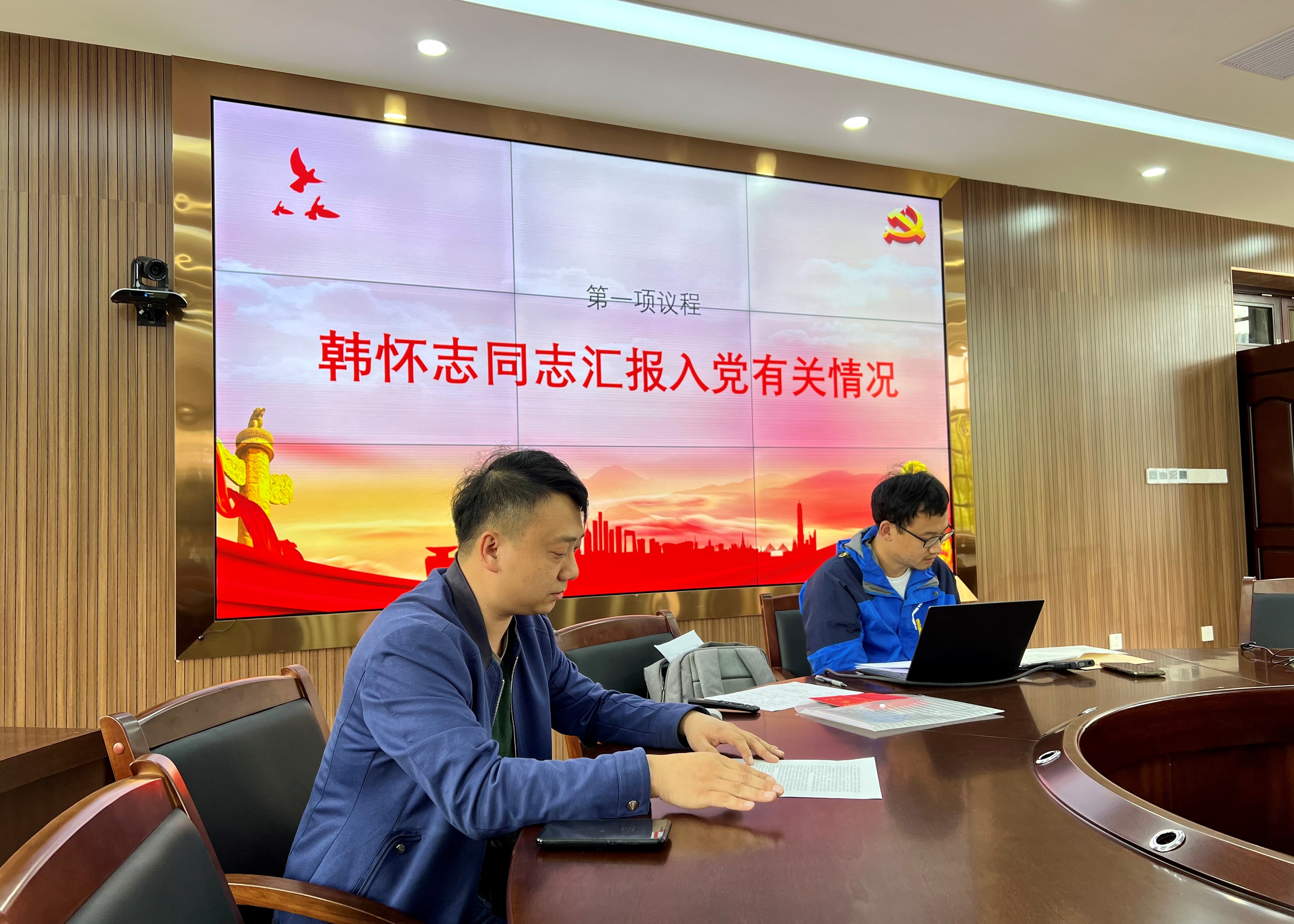 党员大会上,韩怀志同志介绍个人信息与入党动机并宣读了入党志愿书。入党介绍人朱权和谭帅两位同志对韩怀志同志的主要情况进行了详细介绍,均自愿介绍韩怀志同志加入中国共产党。宣传委员鲍泽威同志代表支委会向支部党员大会报告了对韩怀志同志的政治审查情况。与会党员也针对韩怀志同志的工作、思想、政治学习、业务能力等方面的表现发表意见。经无记名投票表决,一致同意韩怀同志的入党申请,确定为中共预备党员。
