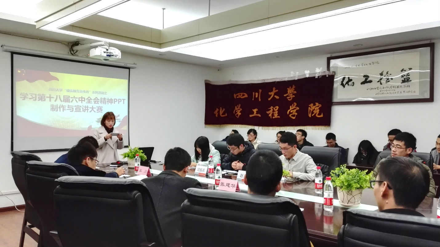 2016年11月23日19点,bb贝博艾弗森官方网站“诚信教育宣传月”系列活动之学习第十八届六中全会精神PPT制作与宣讲大赛在化工楼235顺利举行,本次活动由bb贝博艾弗森官方网站研究生分会主办。参加这次PPT大赛的全部为来自bb贝博艾弗森官方网站的全部14个研究生党支部。bb贝博艾弗森官方网站思政辅导员司振兵老师、化学工程公司党政办公室高敏老师、bb贝博艾弗森官方网站兼职辅导员赵磊学长、bb贝博艾弗森官方网站研究生会主席张川、奚月恒、张建华学长出席了本次活动,并担任评委嘉宾。活动由2016级应化专业研究生徐双凤主持。