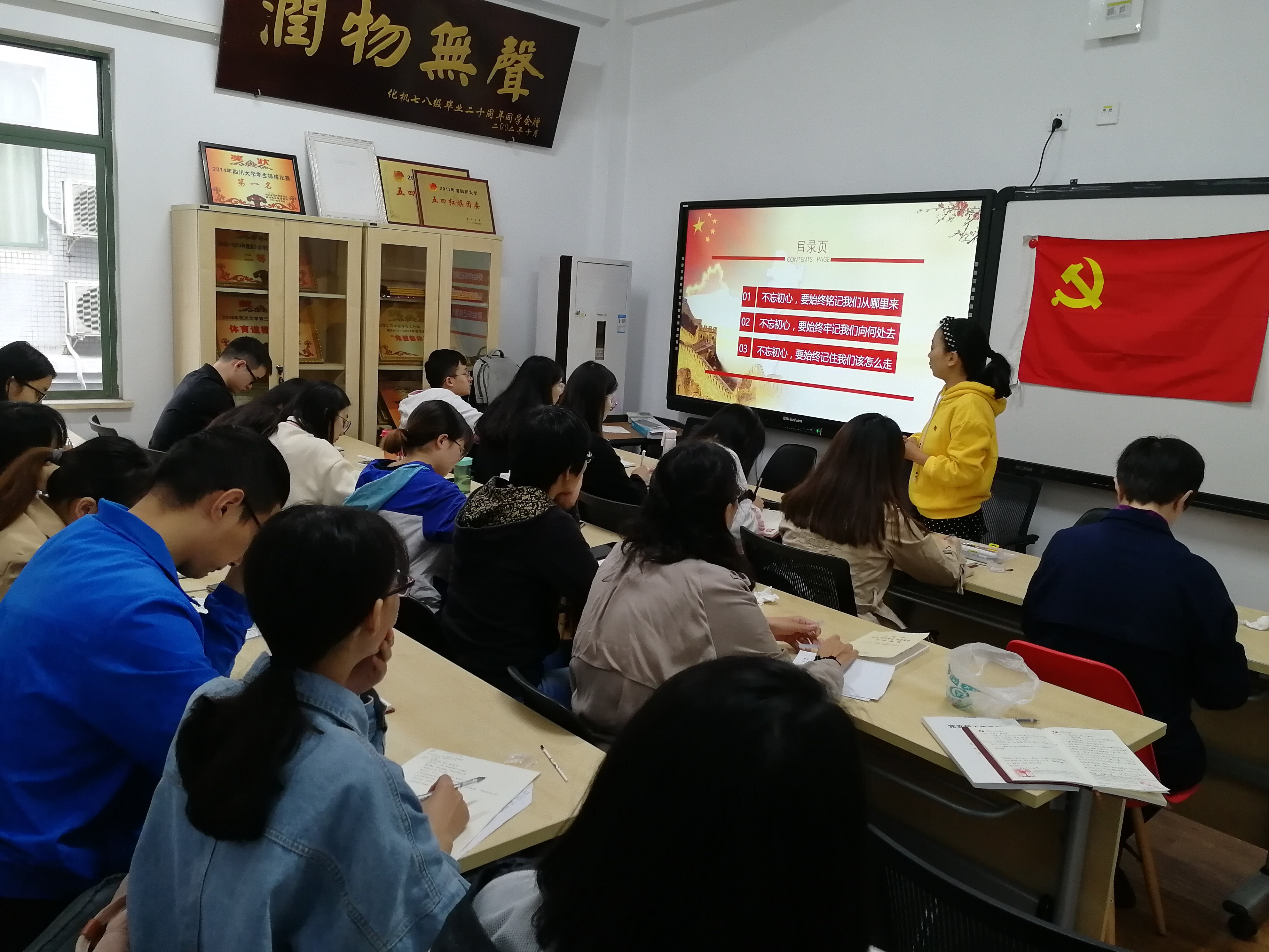 2019年10月24日星期四13:00,bb贝博艾弗森官方网站本科社区支部邀请本科社区党支部书记李珍珍老师在江安校区三舍活动室,为本科社区党支部的党员们开展了“不忘初心,牢记使命”主题党课——“新时代,我们如何做到不忘初心”。化工公司党委副书记姜利寒老师,辅导员王苏宁老师等出席此次活动。