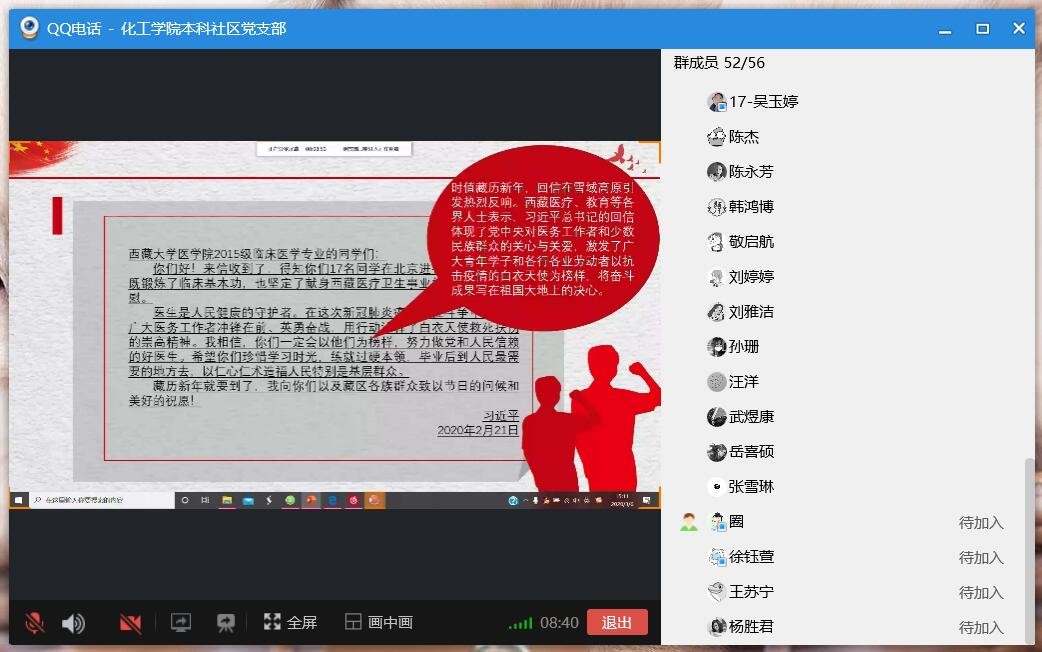 2020年3月6日下午15:00,ballbet贝博官方网站本科社区党支部在党员QQ群开展了第一期线上党组织生活,53名员工党员全部踊跃参加。大家在群内签到后,在线学习了:(1)习近平总书记在统筹推进新冠肺炎疫情防控和经济社会发展工作部署会议上的讲话;(2)习近平总书记给在首钢医院实习的西藏大学医学院员工的回信;(3)《中共教育部党组关于统筹做好教育系统新冠肺炎疫情防控和教育改革发展工作的通知》;(4)《中共教育部党组关于学习贯彻习近平总书记给在首钢医院实习的西藏大学医学院员工重要回信精神的通知》等。同时在线分享了蹇萍秋同志《关于学习习近平总书记应对防疫工作的重要讲话和指示精神汇报》的PPT以及观看了新冠疫情的微视频。