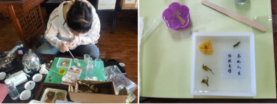 活动的尾声部分,同学们以茶为主题,结合当天参与活动的感受与心情,用水晶滴胶进行了手工创作,其中有同学亲手将茶叶塑封在模具中,制作出精美的小摆件,将茶文化的艺术魅力永久封存。